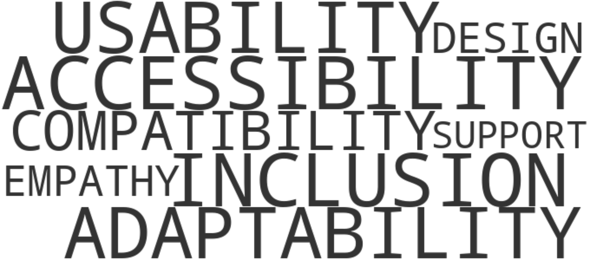 Word cloud of terms such as accessibility, inclusion, and usability, which are displayed most prominently, followed by adaptability, compatibility, and others.