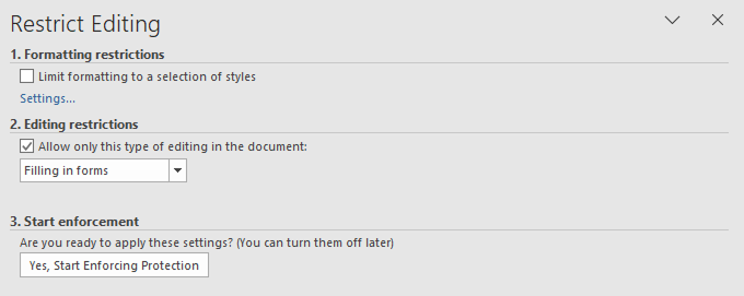 Ideally, you should opt to only lock the sections of your document where your form fields are found, and exclude introductory and instruction sections. This can be done by inserting section breaks and including or excluding those parts from the lock.