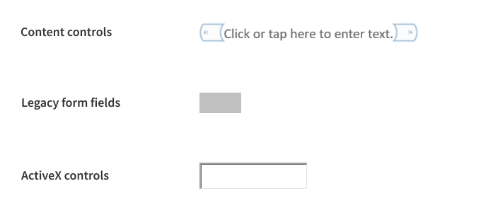 Microsoft Word provides three distinct sets of input types and controls, all of which work differently.